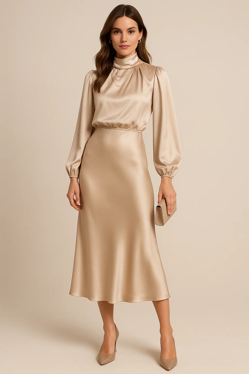 Women’s High Waist Midi Dress – High Neck - Cotton Blend - All-Season Wear